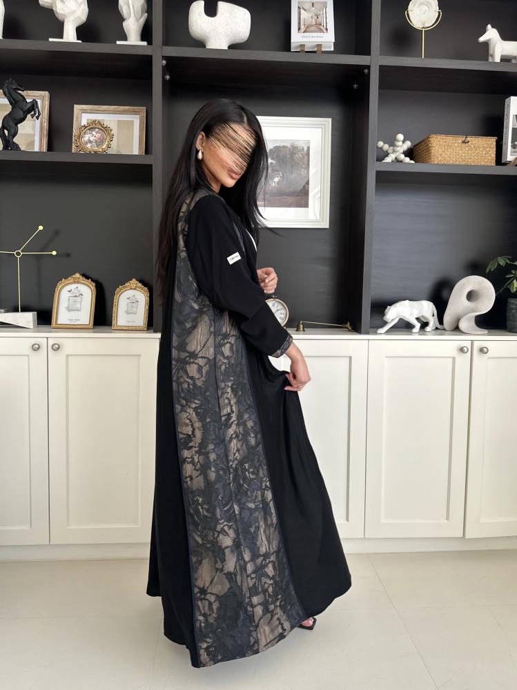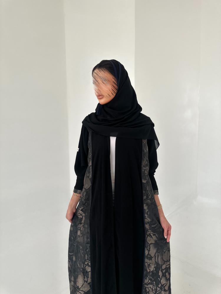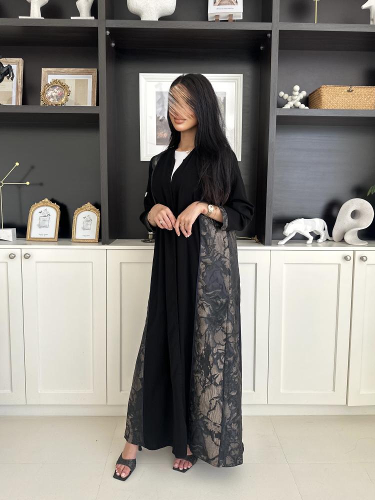 قماش العباية العباية كريب ملكي مع تدخلية من الجوانب جاكار هندي خفيفقصة العباية A line وتتغير حسب طلب العميلة .